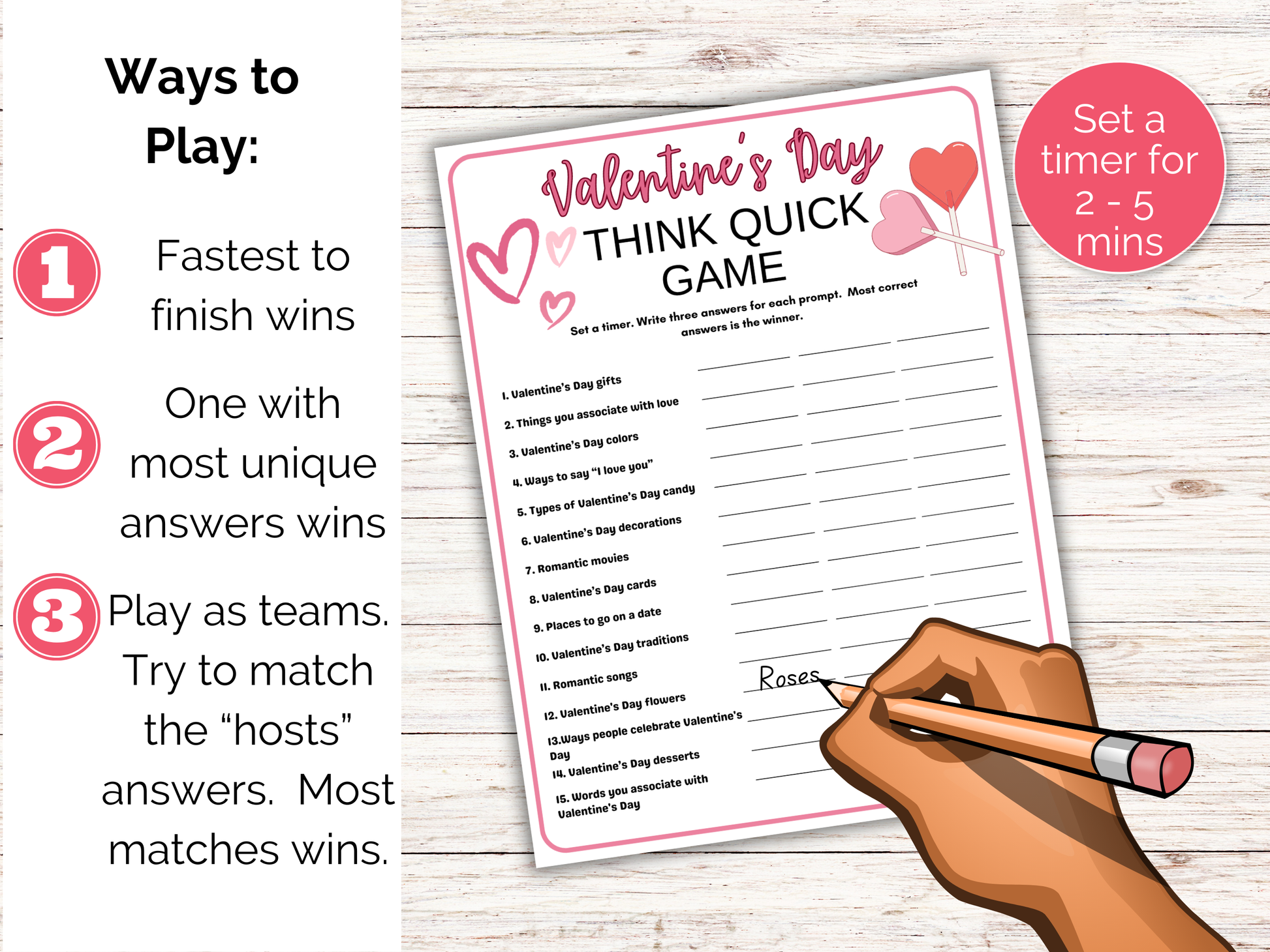 This fun Valentines Day Think Quick Game is a great valentines themed activity for kids and adults to play in the classroom, as a family and more. Simply print the game, set a timer and write your answers.