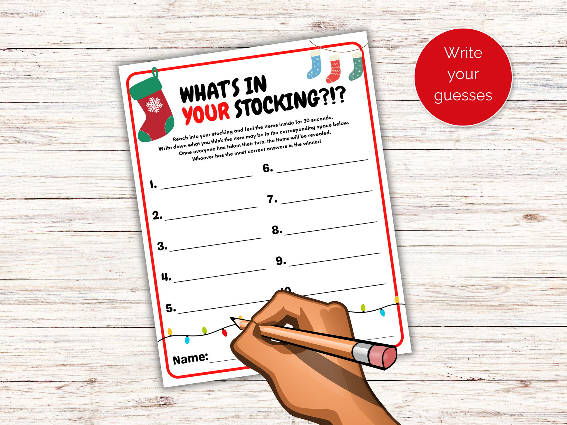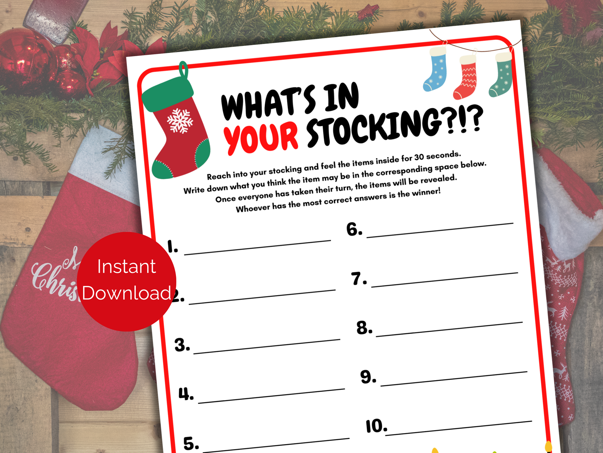 This fun What's in The Stocking Game is a great Christmas themed activity for adults and kids to play at christmas parties, holiday office parties, in the classroom and more. Simply print the game, reach in the stocking and write your guesses.