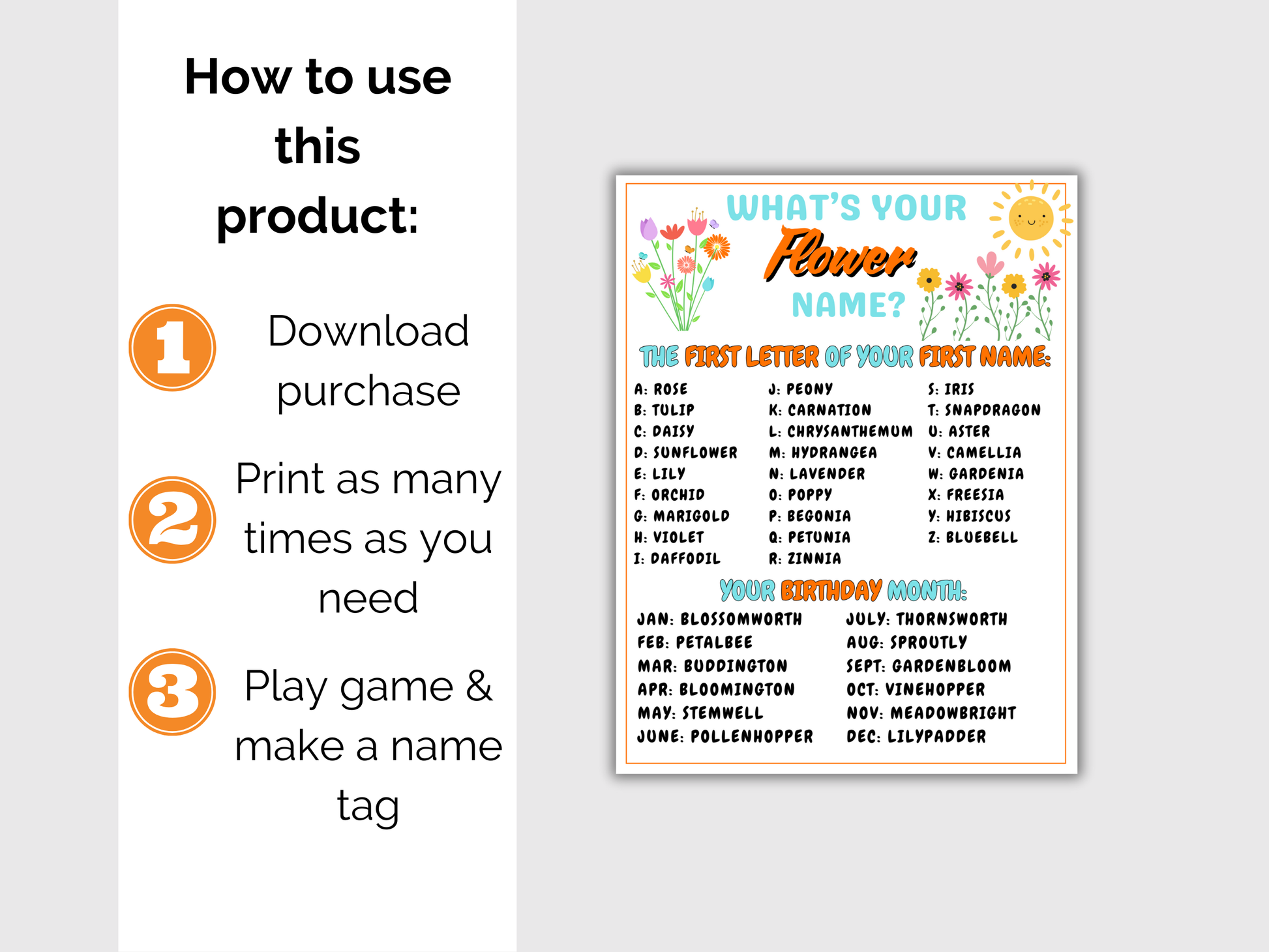 What's Your Flower Name Game - Print on 8.5 x 11 paper.