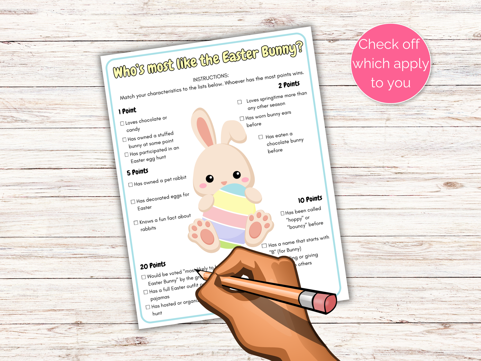 This fun Who's The Most Like the Easter Bunny is a great easter bunny themed activity for adults, teens and kids to play at easter parties, easter egg hunts, on easter sunday and more. Simply print the game, mark which apply to you and total your points.